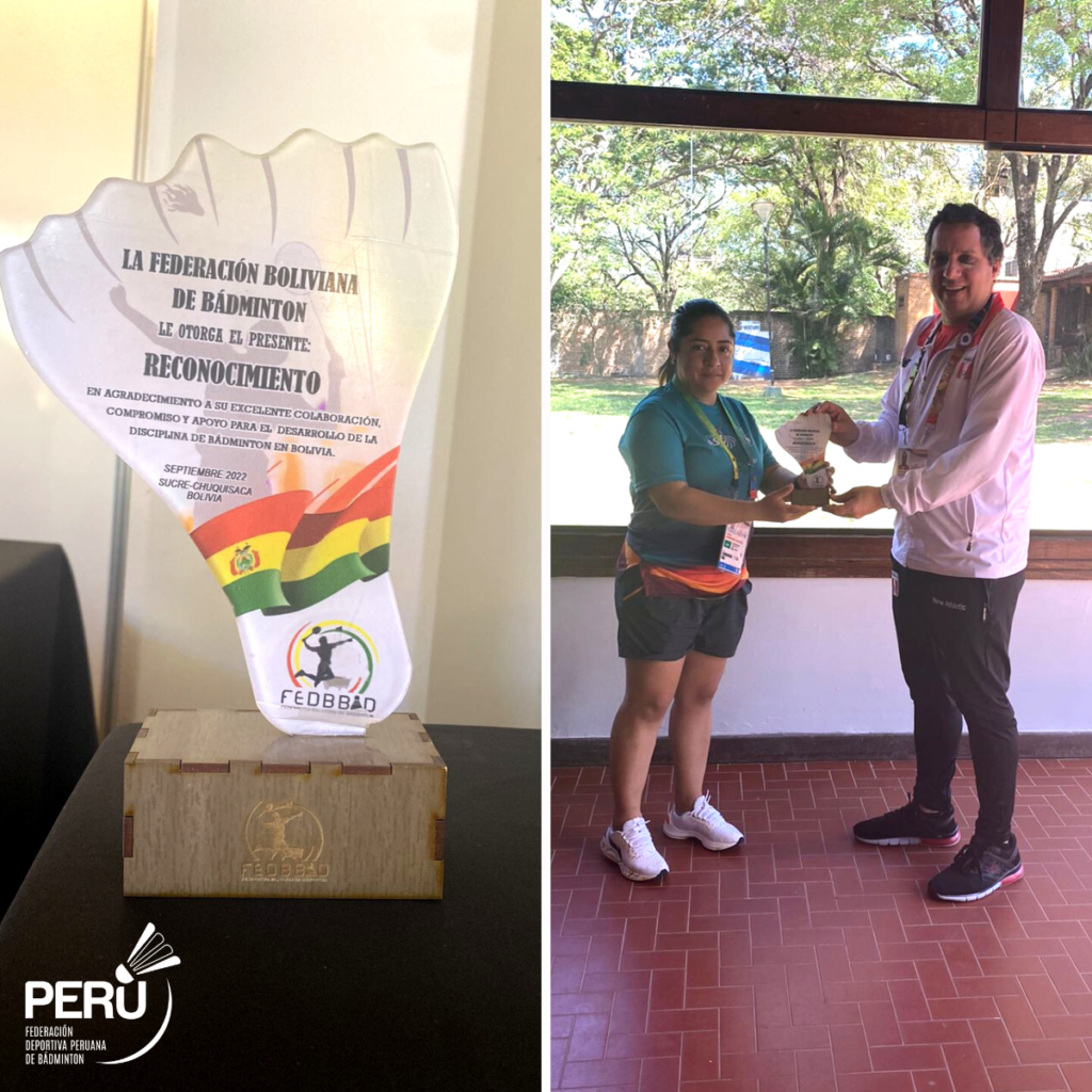 El bádminton peruano recibió un reconocimiento de parte de la Federación Boliviana de Bádminton en el marco de las competencias en los Juegos Suramericanos Asunción 2022. La placa fue entregada por la entrenadora Cindy Avendaño Montes al presidente de nuestra institución, Gonzalo Castillo.