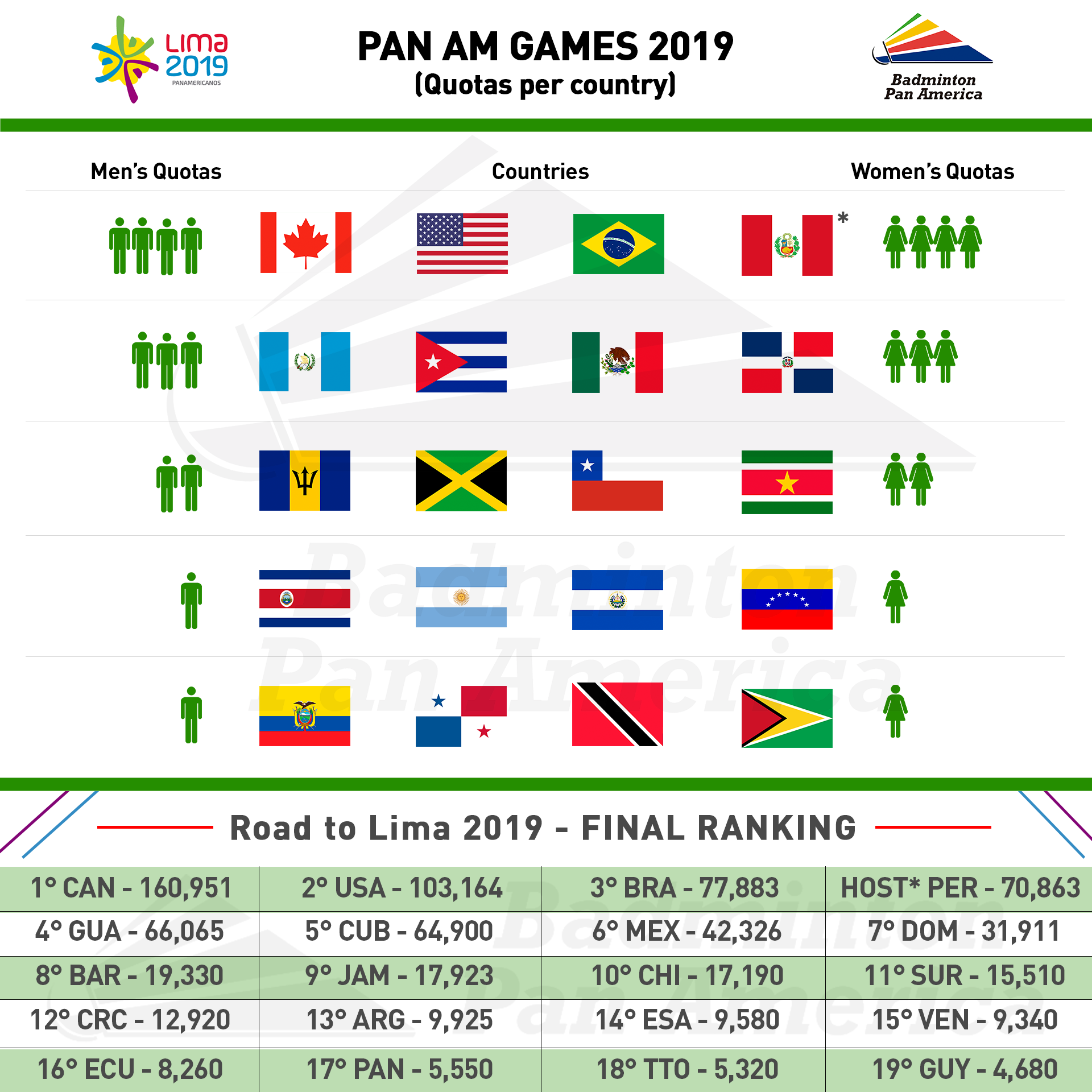 Cabe recalcar que el número máximo de deportistas para bádminton es de 44 para cada rama (masculina y femenina). A partir de ahora, cada país determinará a los jugadores que los van a representar considerando que pueden registrar un máximo de 3 jugadores para la modalidad individual y 2 parejas para dobles.