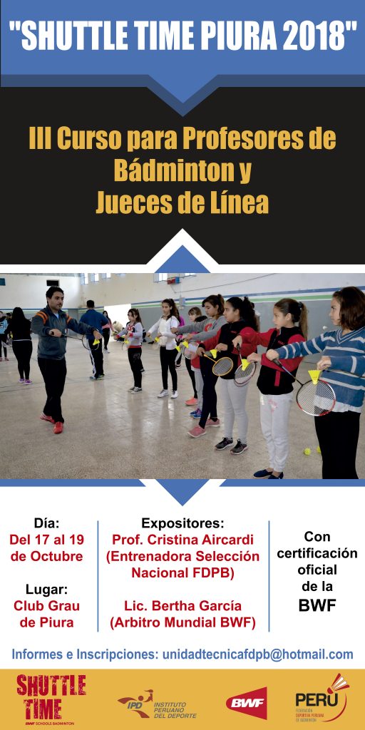 Además, también se realizará el “III Curso para Profesores de Bádminton y Jueces de Línea”, el cual se llevará a cabo en el Coliseo Club Grau desde el 17 hasta el 19 de octubre.
