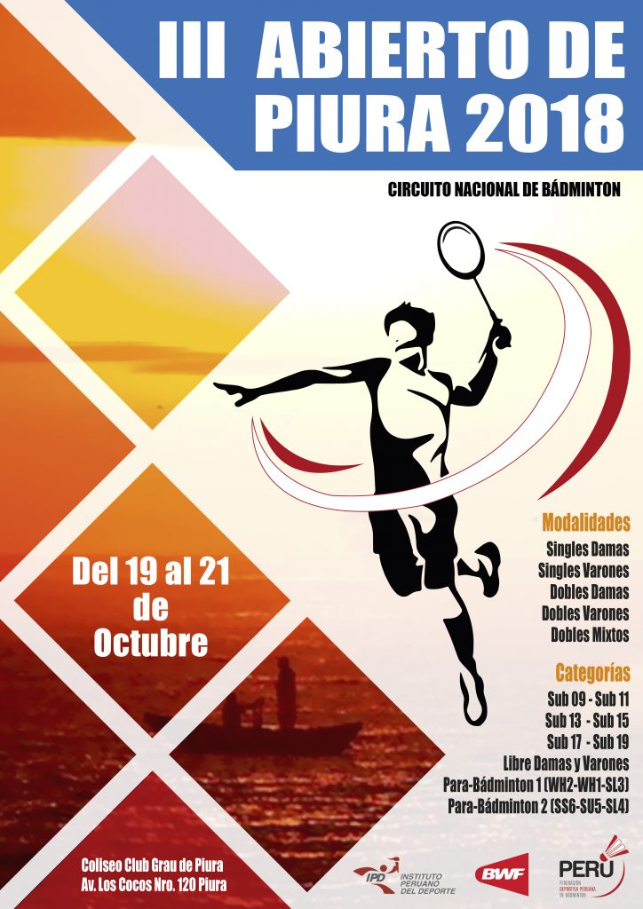 Piura, por tercera vez en su historia, es el escenario escogido para que se realice la octava parada militar del Circuito Nacional de Bádminton. El norte del país recibirá el “III Abierto de Piura”, torneo que se realizará del 19 al 21 de octubre en el Coliseo Club Grau de Piura.